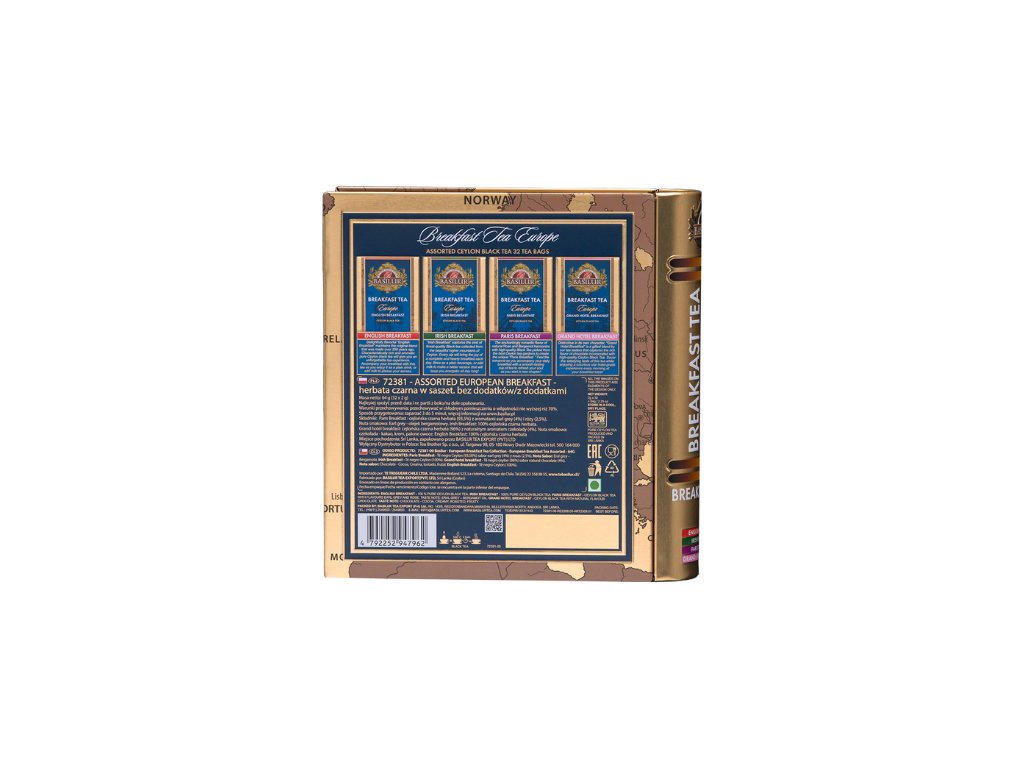 Zloženie: PARIS BREAKFAST - čierny čaj, aróma (bergamot, ruža), IRISH BREAKFAST - čierny čaj, GRAND HOTEL BREAKFAST - čierny čaj, prírodná aróma (čokoláda), ENGLISH BREAKFAST - čierny čaj