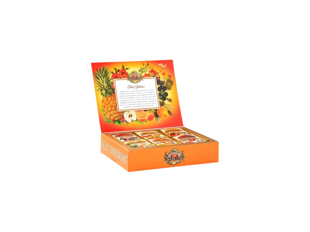 Basilur Fruit Infusions čajová kazeta porciovaná s mixom ovocných čajov.