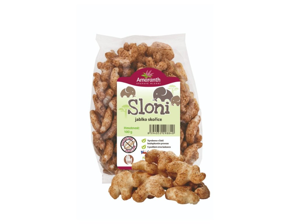 AMARANTH Slony jablko škorica 100 g sú jemné extrudované bezlepkové chrumky v hravom tvare sloníkov s príjemnou vôňou jablka a škorice. Vďaka kombinácii ryžovej a amarantovej múky s kúskami sušeného jablka a pridanou škoricou ponúkajú mierne sladkú chuť, ktorá osloví deti aj dospelých hľadajúcich ľahký snack. Produkt je bez lepku a bez umelých sladidiel a hodí sa ako rýchla desiata či maškrta medzi jedlami.
