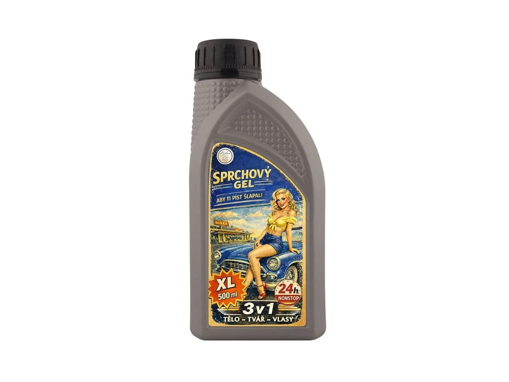 Retro industriálny sprchový gél 3v1 - Blondýka je originálna pánska kozmetika, ktorá zaujme na prvý pohľad. Štýlová retro etiketa inšpirovaná pin-up motívmi a netradičná industriálna fľaša pripomínajúca obal motorového oleja vytvára z tohto sprchového gélu nielen praktický kozmetický produkt, ale aj vtipný darček pre mužov. Dizajn fľaše je inšpirovaný automobilovým svetom a pôsobí ako nádoba na motorový olej. Vďaka tomu je sprchový gél ideálnym darčekom pre mužov, ktorí majú radi autá, techniku ??alebo originálne a neobvyklé veci.